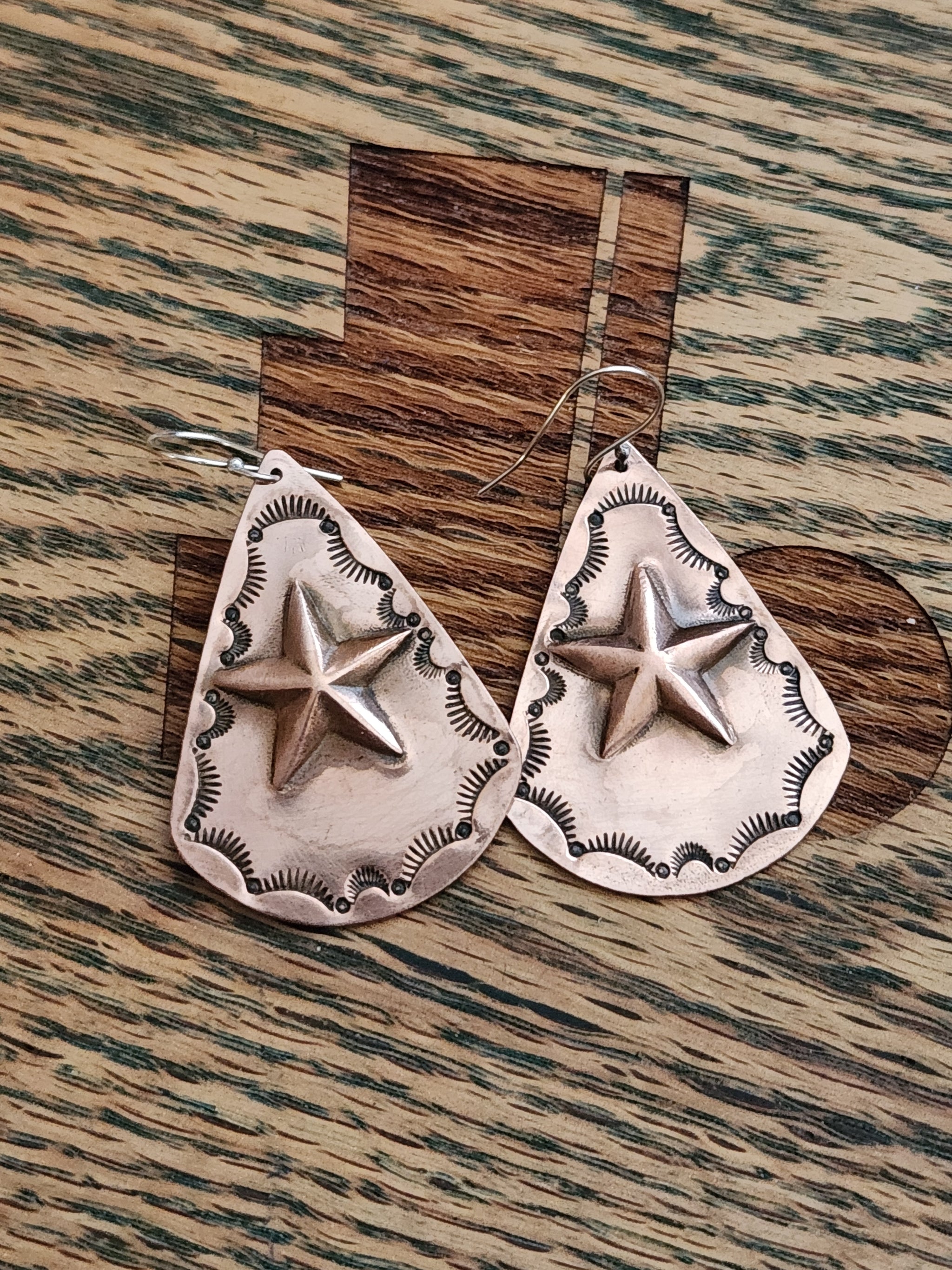 Hand stamped copper dangle earrings with repousse star and sterling silver earwires.